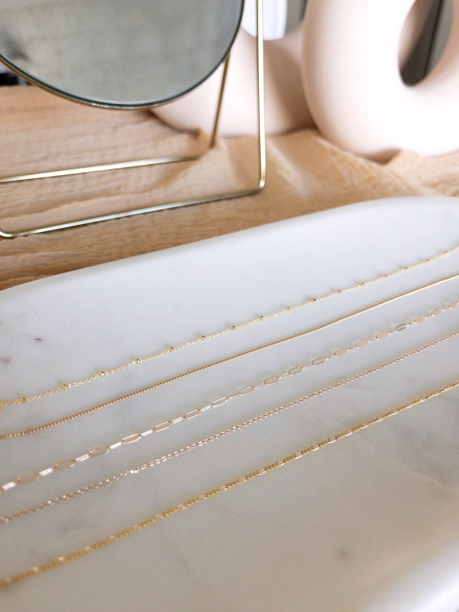 Permanent jewelry is welded jewelry, custom-sized to fit your wrist, neck, ankle, or finger. After selecting the chain of your choice, our trained Linkers perfect the fit and weld the metal to create your clasp-free bracelet, necklace, anklet, or ring. The sustainable, 14k white and yellow gold chains present a minimal aesthetic but don't require delicate wear.