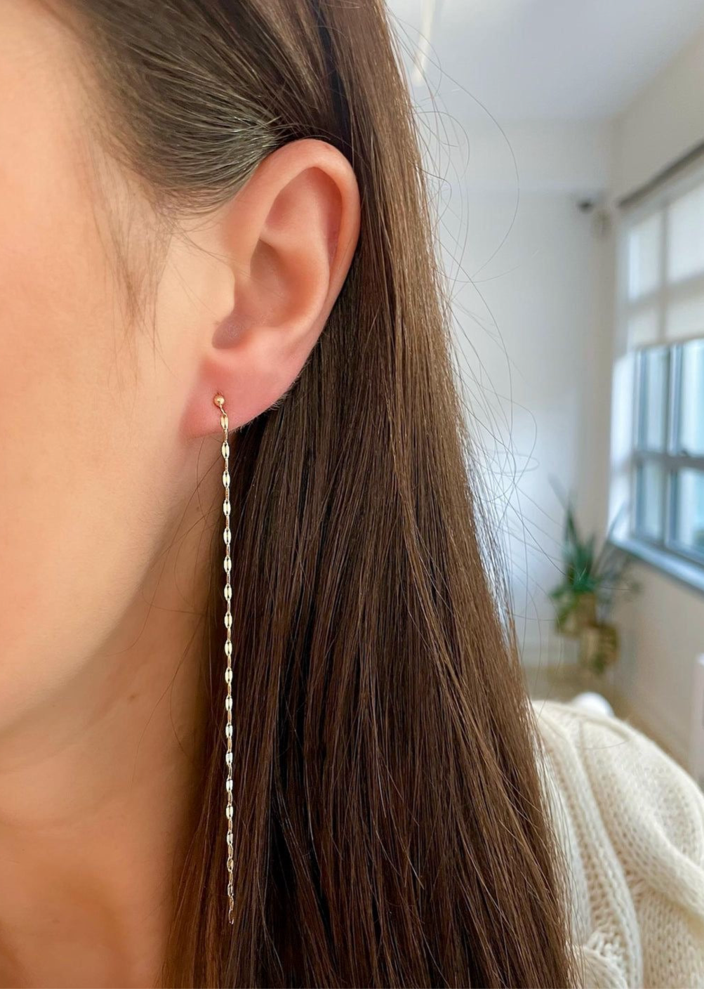 These solid 14k gold dangle earrings have a friction back closure and measure 4 inches in length.